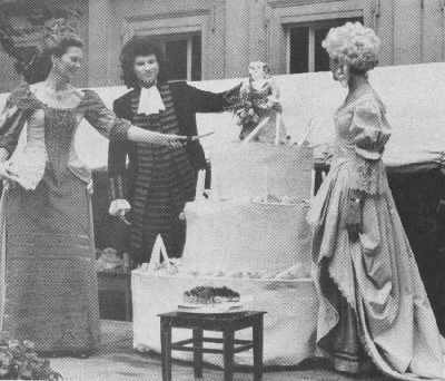 den Schulhof und schnitt eine riesige Geburtstagstorte an.