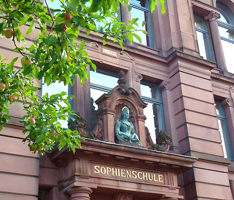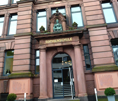 Den Haupteingang ziert die Büste unserer Namensgeberin, der Kurfürstin Sophie, der wir uns stark verbunden fühlen. So nennen wir unsere Schule liebevoll die "Sophie" – hannöversch "Soffi" ausgesprochen.