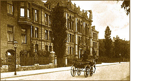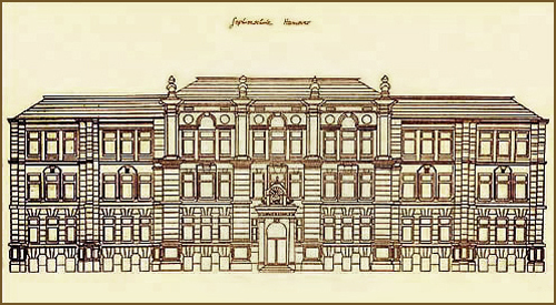 Die Bilder unten zeigen den Blick auf das Gebäude in der Seelhorststraße um 1907. Die Kutsche fährt immerhin schon auf einer gepflasterten Straße! Daneben ist eine der ersten Skizzen des Architekten Rowald zu sehen, die gut die harmonische Gliederung der klassizistischen Fassade wiedergibt.