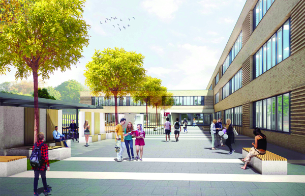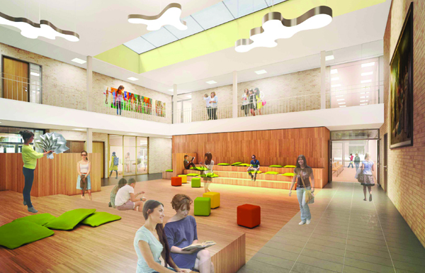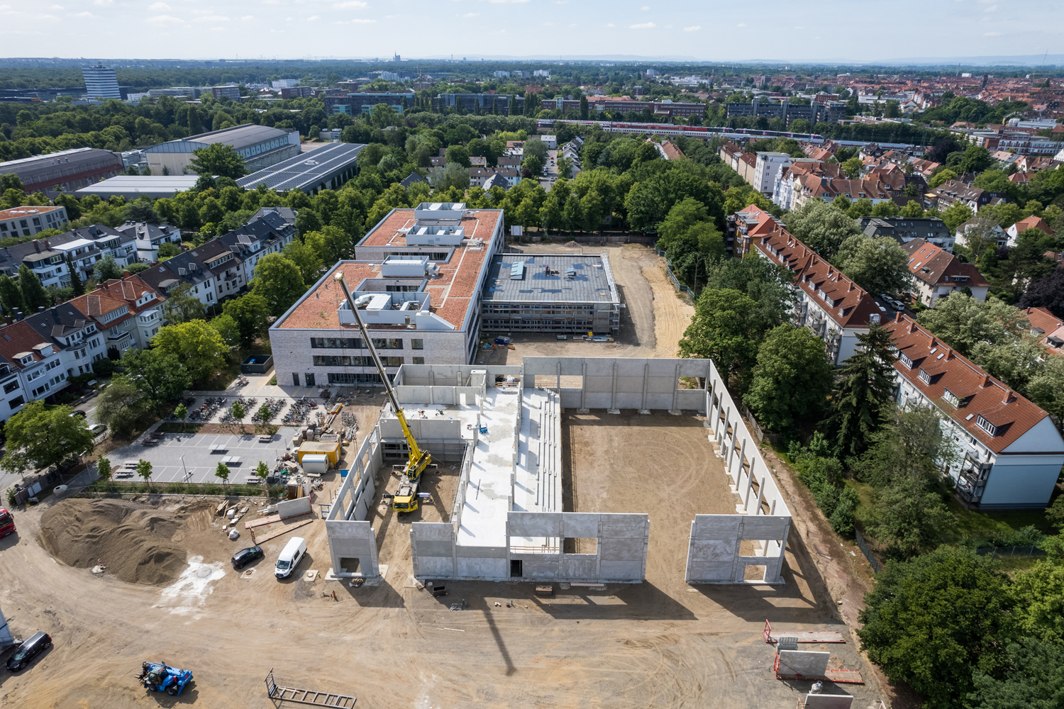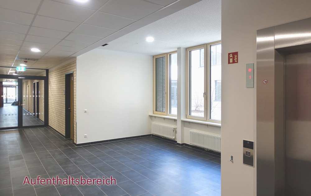 Hier sehen Sie eine Luftbildaufnahme vom Frühjahr 2022 sowie die ursprünglichen Planungsgrafiken für den Haupteingang Schackstraße und das Foyer mit Aufenthaltsbereich.